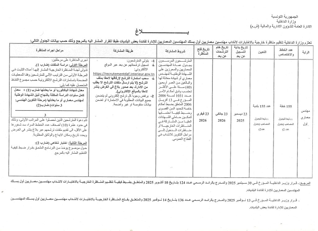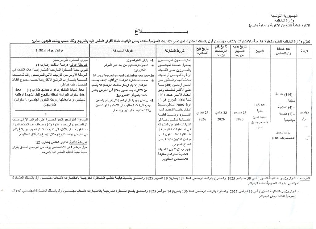 تعتزم وزارة الدّاخليّة تنظيم مناظرة خارجية بالإختبارات لانتداب مهندسين أُول بالسلك المشترك لمهندسي الإدارات العمومية لفائدة بعض البلديات وذلك حسب البيانات التالية: الرتبة: مهندس أول. عدد الخطط والاختصاص: 140 هندسة مدنيّة، 04 إعلاميّة، 01 هندسة ميكانيكيّة. التعيين: عدد 145 بلدية. تاريخ بداية التسجيل عن بعد: 23 ديسمبر 2025. تاريخ ختم الترشحات عن بعد: 23 جانفي 2026. تاريخ فتح المناظرة: 23 فيفري 2026